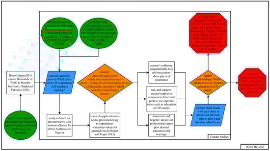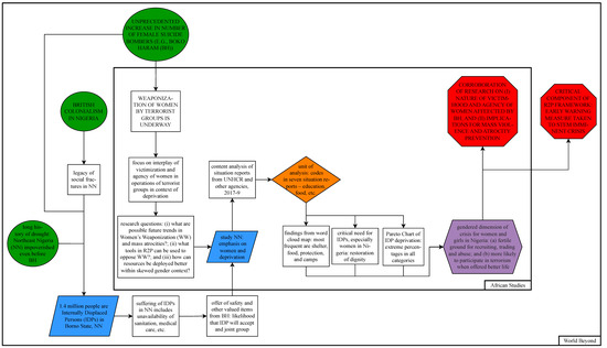The purpose of this article is to present findings, relationships, and value added from research on the experiences of women with terrorism in North-East Nigeria to interdisciplinary spaces and practice by using systemist diagrammatic representations. This work is regarded as worthwhile in both substantive and methodological terms for the following reasons: First, respective research projects with policy relevance will be presented in a visual format, highlighting their connectedness—easily digestible, but without losing the depth and breadth of the work. Second, the article provides a combination of diagrams with text (i.e., background methods and findings), making the contents accessible to different kinds of learners. Third, and finally, the visual approach creates clear interdisciplinary connections that provide a sound basis for further research, policy design, and practice without the loss of academic rigor.