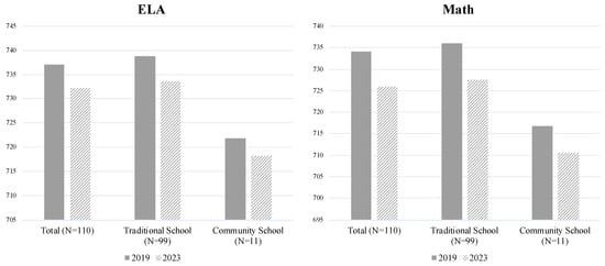 In this exploratory study, we examined how community schools in a large urban district experienced and responded to the COVID-19 pandemic. We first descriptively examined school-level performance in standardized exams between 2019 and 2023 across community and traditional schools in a large urban school district. On average, school-level standardized test scores declined over the years of 2019 and 2023 in both ELA and mathematics, aligning with national trends (). Also following national-level trends, schools reported larger declines in the average scale scores in math (8.16-point decrease) than in ELA (4.95-point decrease).