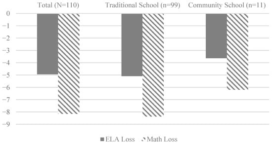 Figure 2 reports the difference in state assessment scores for ELA and math between 2019 and 2023. Schools, on average, reported a 4.95- and 8.16-point decline in their state assessment scores in ELA and math, respectively. Following national-level trends (), schools had larger declines in math assessments than in ELA assessments. The declines in state assessment scores were slightly smaller for community schools compared to traditional schools in ELA and math, though the differences are minimal. While traditional schools reported a 5.09- and 8.38-point decline in ELA and math scores respectively, community schools reported a decline of 3.64 points in ELA and 6.20 points in math.