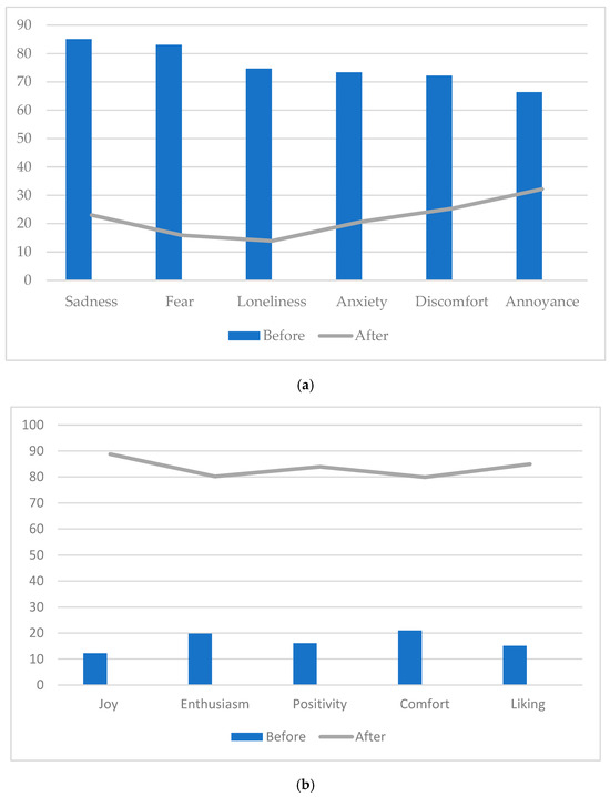 (a) Percentages of negative emotions reported in the two episodes (n = 640); (b) percentages of positive emotions reported in the two episodes (n = 640).