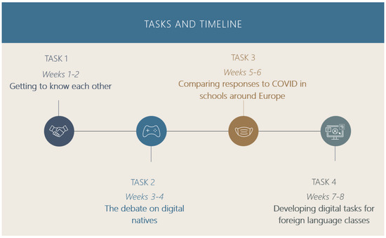 To achieve this, working groups of student teachers from both countries and in-service teachers from various European countries were expected to complete different tasks related to the theme of foreign language teaching. These included agreeing on the working rules for their international working groups; discussing with the in-service teachers the concept of digital natives, which relates to learners who grew up with digital technologies and are therefore supposed to be especially tech-savvy (Prensky 2001), and its role in education; interviewing the in-service teachers about different national approaches to teaching during the COVID-19 crisis; and finally, working together to develop teaching tasks involving online technologies and resources which the in-service teachers could then trial in their classrooms. The timeline of the tasks during the Virtual Exchange is presented in Figure 1 below.