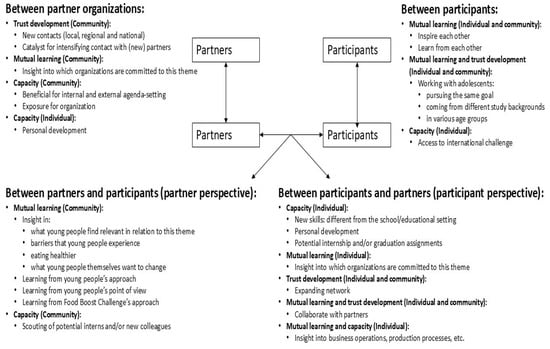In this study, we set out to explore the impact of the Food Boost Challenge (FBC) by focusing on innovative idea generation and how participation affected young people and partners, at both the individual and community level, using the following indicators of community-based participatory action research (CBPR): trust development, capacity, mutual learning, and power dynamics. These indicators are based on the CBPR conceptual model by (). The analysis of interviews, feedback surveys, and partner management meetings revealed impacts categorized under trust development, mutual learning, power dynamics, and capacity, both at the individual and at the community level.