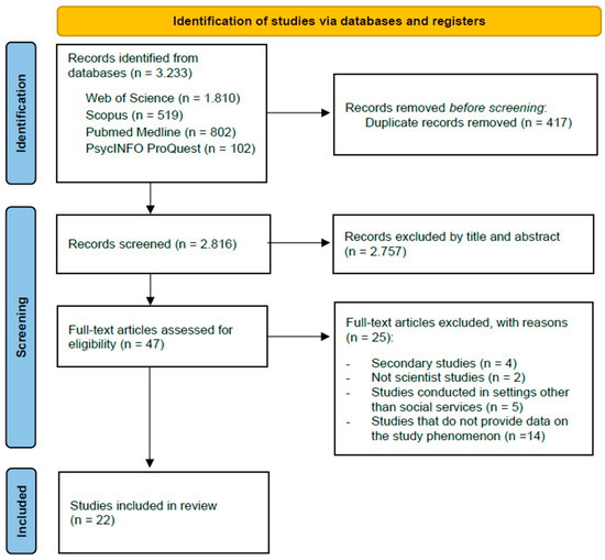The literature search and study selection process are shown in the PRISMA flow chart in Figure 1. The literature search yielded a total of 3233 references. After removing duplicate records (417 studies), a total of 2816 references were screened. During the second stage of the screening phase, 2757 studies were eliminated after independent peer review of the title and abstract, and discrepancies were resolved by third-party review. In addition, 12 studies were excluded in this step due to the inaccessibility of the full text of the papers. A total of 47 studies were selected for full-text peer review, our of which 25 references were eliminated after applying the proposed exclusion criteria: (1) studies that are not scientific articles (n = 4); (2) studies on a different topic (n = 15); and (3) studies conducted in settings or institutions other than social services (n = 6). Finally, 22 studies (Albers and Millar 1993; Alecu et al. 2024; Altreiter and Leibetseder 2015; Andreetta 2022; Bergmark and Stranz 2022, 2023; Considine et al. 2022; Gallagher et al. 2002; Germundsson and Stranz 2023; Germundsson 2024; Harpring et al. 2014; Hussénius 2019; Hussénius 2021a; Hussénius 2021b; Kallio and Kouvo 2014; Minas 2005; Minas 2006; Palacio 2021; Pithouse et al. 2011; Stranz et al. 2016, 2024; Tarone and Kuehn 2000) were included in the thematic synthesis of this systematic review.
