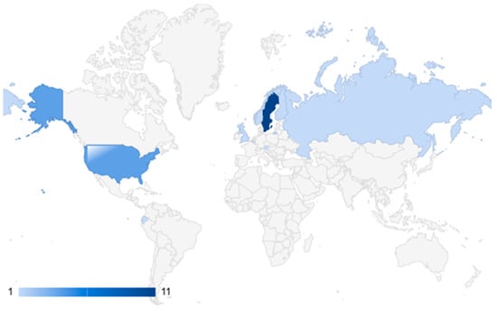 The studies cover a period of 31 years (1993–2024). The total sample consists of 12,863 participants, spread over nine countries. These countries are the following: United States (USA) (n = 4), Sweden (n = 11), Norway (n = 1), Belgium (n = 1), Finland (n = 1), Austria (n = 1), Russia (n = 1), Ecuador (n = 1) and England (n = 1). Figure 2 provides a choropleth map that clearly shows the global distribution of the publications included.