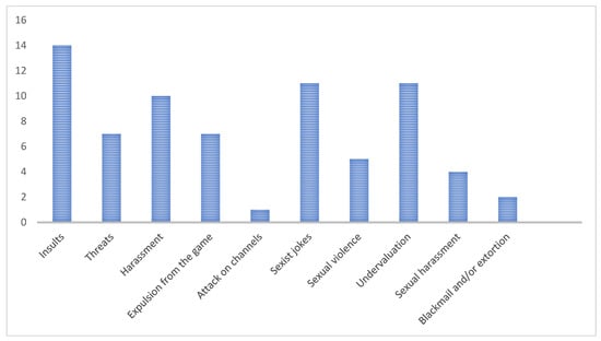 Many women have experienced online violence or know someone who has been a victim of such situations, both in videogames and on social networks (Fernandez 2017). According to the 32 BITS Conclusions Report on the experiences of women in online videogames, prepared by the research team Arroyo et al. (2022), many participants reported instances of harassment, including insults, threats, and discrimination. Other mentioned experiences included sexual violence such as inappropriate images and sexual comments, as well as feelings of being undervalued or belittled in the gaming context. Some respondents also reported being expelled from games or experiencing harassment through social media channels like TikTok, Instagram, and Twitch (see Figure 1).