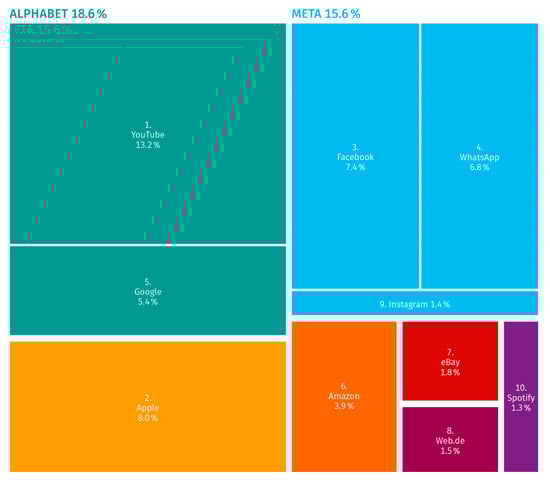 Thanks to this holistic measurement of digital media usage, it is possible to quantify precisely the attention shares of the individual competitors on the basis of the entire aggregated duration of use (total duration). As we can see, a very large proportion of digital media usage takes place on the few offers of the tech giants, respectively, “GAFA”.