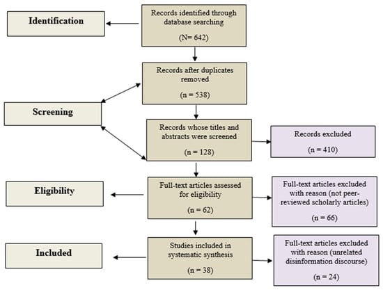 An extensive database search was conducted across Scopus, Web of Science, ResearchGate, Google Scholar, PubMed, and EBSCOhost using Boolean search strings related to key themes: “climate change disinformation”, “epistemic welfare”, “social media and misinformation”, “post-truth era”, and “digital public sphere”. This search yielded 642 records published or posted as preprints between 2010 and 2024. Following retrieval, 104 duplicate entries were removed using Zotero reference manager. The remaining 538 unique records were screened based on titles and abstracts to ensure thematic relevance to climate change disinformation and epistemic impacts. In total, 410 articles were excluded at this stage due to irrelevance and insufficient empirical grounding.