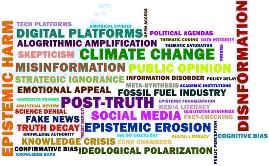 To complement the systematic synthesis of the 38 studies analyzed in this meta-synthesis, a word cloud was generated to visually represent the most frequently occurring concepts, themes, and terms. This visualization offers an accessible semantic snapshot of the dominant discourses emerging from the literature on climate change disinformation in the digital age. The prominence of certain terms reflects their centrality in the academic conversation, while smaller, yet meaningful, terms help capture the dynamics within the post-truth digital public sphere. The word cloud serves as both a visual entry point and a thematic anchor for the qualitative patterns discussed in the next sections.