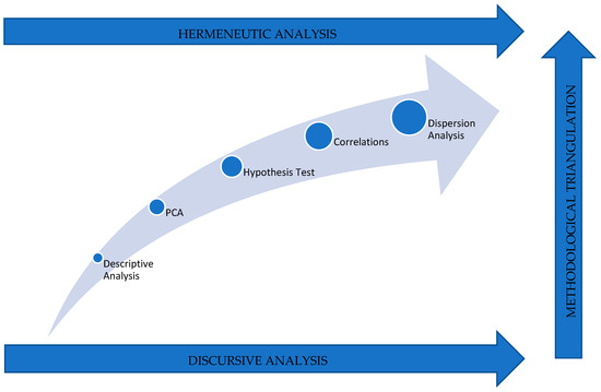 At the quantitative level, using SPSS statistical software v.26.0 (IBM Corp 2019), the methodological development began with a descriptive analysis of the data identifying frequencies to characterise the sample. In the second phase, a principal component analysis (PCA) was performed with direct, oblique rotation in which clusters of variables were identified according to their response orientation to the item with a KMO reliability greater than 0.5. The development of the clusters resulted in factors that, in turn, have regression values, which were identified and labelled.