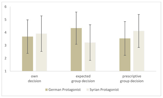 The analysis revealed an interaction effect of protagonist and measure (F (1.56, 620.63) = 11.73; p < 0.001; ηp2 = 0.03). Pairwise comparisons revealed that for their own decision and the prescriptive group decision, participants were more inclusive of the Syrian protagonist than of the German one, whereas in the expected group decision, participants expected their group to be more inclusive of the German protagonist (see Figure 1).