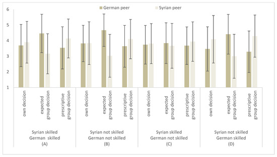 However, additionally, there was a significant three-way interaction of protagonist, measure, and condition (F (4.67, 620.63) = 9.48; p < 0.001; ηp2 = 0.07). Pairwise comparisons revealed that the patterns varied between the different conditions. For their own decision, in the condition where the German was skilled and the Syrian was not skilled, participants were more inclusive of the Syrian protagonist than of the German protagonist (p = 0.006). In all other conditions, the differences between the Syrian and the German peer were not significant (p > 0.05). For the expected group decision and the prescriptive group decision, there were no differences between the two protagonists in the condition where the Syrian was skilled and the German was not skilled (p > 0.05). In all other conditions, participants expected the group to be more inclusive of the German protagonist than of the Syrian one (ps < 0.001); however, they indicated that they thought that the group should be more inclusive of the Syrian protagonist (condition A: p = 0.006; condition B: p = 0.039; condition D: p < 0.001). See Figure 2 for an overview of the adolescents’ inclusion decisions on all three measures by experimental condition.
