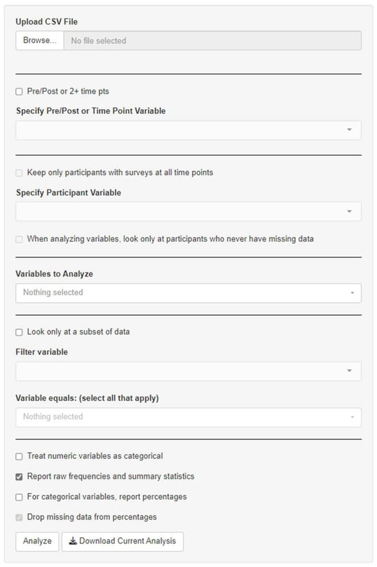 Figure 1 below shows the tool’s interface, illustrating the process of uploading a CSV file and configuring the data for analysis, including handling categorical variables and pre-post survey formats. It is worth noting that the tool does not support in-app data transformations such as combining categories or reordering factor levels. These types of modifications are common in survey analysis and are typically handled prior to using the tool. Users are expected to prepare their datasets in advance. In some cases, minimal data cleaning, such as resolving duplicate entries or managing instances where participants completed multiple surveys, may be conducted in software like Excel.