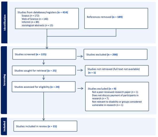 Via consultation with an academic liaison librarian, the following databases were identified as those most likely to provide a broad view of the topic and result in an identification of the extant literature: Web of Science (all databases), Scopus, Informit (all databases), and Sociological Abstracts. The base search strategy was: vulnerab* OR disab* AND payment AND research AND participant*, with the following database-specific refinements: Web of Science (TS = title, abstract, keywords); Scopus: (=title, abstract, keywords); Informit: (=all fields); Sociological abstracts: (NOFT = anywhere except full text—includes abstract, etc.). The search was conducted in 2023, and the identified studies (n = 414) were uploaded into the Covidence systematic review management software where duplicates were removed (n = 189) and an initial abstract-based relevancy review of the remaining 225 records was undertaken based on the inclusion criteria. Two hundred records were removed at this stage in the review, leaving 25 records for full-text screening. The full text of the publication was identified for 24 studies, and 10 studies were subsequently removed because they did not meet the inclusion criteria. We did not assess for quality in line with the PRISMA-ScR guidelines. Figure 1 below provides the PRISMA diagram for the study selection stages.