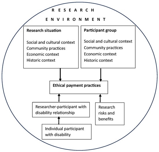 This diagram is preferable to a list of questions that can be worked through because it encourages a broad understanding of the research environment, rather than a tick-box exercise, which may miss the most relevant aspects of a particular research context. The diagram includes the following key elements: the research environment; research situation; participant group; risks and benefits of the research; individual context; relational context; and research practices. The research environment refers to the institutional and research-team context relevant to the project, which impacts on the extent to which the needs and interests of people with disability will be understood and respected. It considers any practical issues, such as project budgets, which may impact payment, as well as important issues about the extent to which participant experiences are likely to be interpreted and understood by the research team. From the perspective of the second author who is a researcher with the lived experience of disability, shared experiences with study participants with disability can help to reinforce the importance of ethical payment practices within the research environment. For example, the neurodivergent author’s previous experiences with ableism where they were expected to participate in studies for little or no monetary compensation motivates them to be considerate of the financial needs of study participants with disability. The research situation refers to the broader cultural context in which the research is taking place, including the social, economic, and historical context in which the research is situated. This context can impact on the rates and types of payment and other contextual factors which might constrain or enhance decision-making around the payment. Considering the participant group necessitates the researchers gaining a clear understanding of the situation of the group of people with disability that are being invited to participate in the research and any relevant contextual factors which may be relevant to the payment for participation and their decision-making around participation. This includes consideration of different approaches to payment that may reflect cultural differences and the intersectional needs of participants and participant groups. It should also consider any stereotypes surrounding people with disability, which might lead to assumptions about capacity, payment types and rates, and so forth. An understanding of the participant group is best gained by developing connections with the community that the potential participants belong to. The actual research risks and benefits are important to consider because they draw attention to the consequences to the participant of the decision to participate or not, and are essential in considering justice, reciprocity, and the consequences to the research of not including their voice.