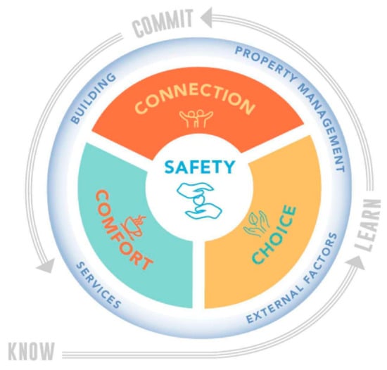 The quality of these four core principles—safety, comfort, connection, and choice—is contingent not only upon architectural and design characteristics but also on the presence and quality of onsite services and property management practices. Accordingly, the TID conceptual framework integrates both service provision and property management as central components of the realization of health and well-being for end users.