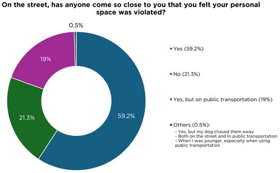 The survey included 21 questions with multiple-choice options, allowing respondents to add comments. Three questions were optional, enabling respondents to provide extended answers, which complicated data processing due to the unexpectedly high response rate of 500 women within the first 24 h. One of the optional questions asked, “If you have been a victim of street sexual harassment, could you share your experience?” Of the 338 responses, 10 highlighted elements of a crime, including the wearing of a skirt—the victim being blamed for clothing (Figure 1 and Figure 2).