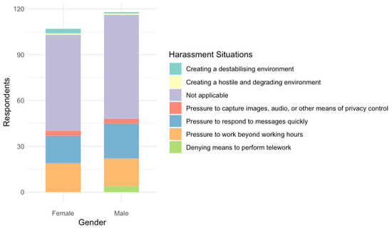 While some teleworking challenges, such as privacy pressures, show minimal gender disparity, others—like extended working hours and workplace hostility—highlight persistent inequalities. The results do not reveal any significance, so it is crucial to visualise the data in order to understand whether being a man or a woman affects situations of harassment in teleworking in any way.