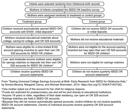 The SEED for Oklahoma Kids (SEED OK) experiment is a large-scale test of a statewide CDA policy. The experiment’s probability sample was randomly drawn from infants in Oklahoma at birth (Huang et al. 2021). The sampling frame was the population of Oklahoma infants born in two 3-month periods in 2007, with oversampling of African Americans, American Indians, and Hispanics. The randomized experiment’s design (Sherraden et al. 2018) allows researchers to attribute causality of observed impacts to the CDA policy intervention and then to generalize those results to the full cohort in the Oklahoma state population.