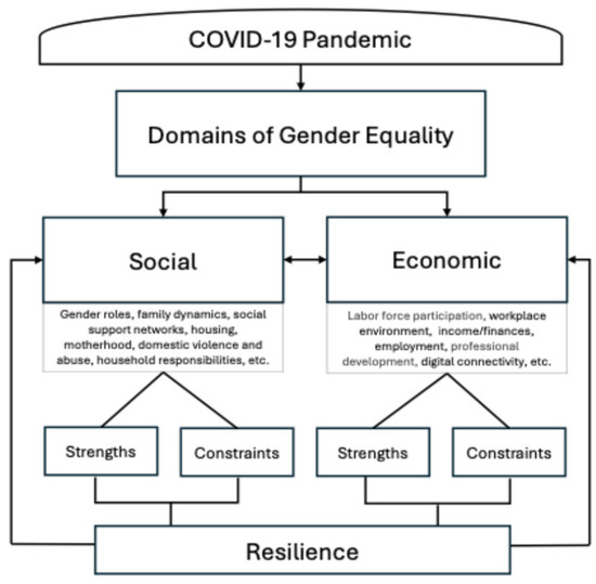 The original framework was adapted to incorporate resilience, as well as the strengths and constraints shaping it, in order to assess the gendered impacts of the COVID-19 pandemic on women within the social and economic domains of gender equality (Figure 1).