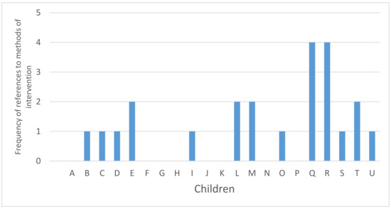 The discussion refers to four intervention methods: this number represents the highest in terms of frequency, with only one other child discussed having received as many different intervention methods. The social worker provided some details about each method; however, this level of insight was the exception rather than the norm.