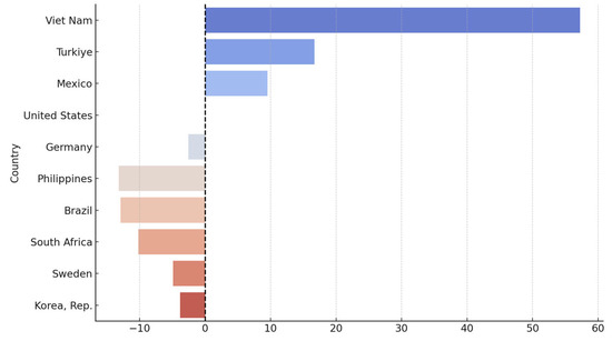 Figure 1 illustrates cross-national differences in changes to female manufacturing employment from 2013 to 2022. Mexico and Türkiye show substantial increases, likely reflecting policy shifts favoring labor-intensive industries and gender-inclusive labor strategies. In contrast, declines in the Philippines and South Korea may reflect economic transitions toward services or persistent gendered barriers. These variations highlight the systemic nature of labor market change and underscore the need for multi-dimensional policy approaches.