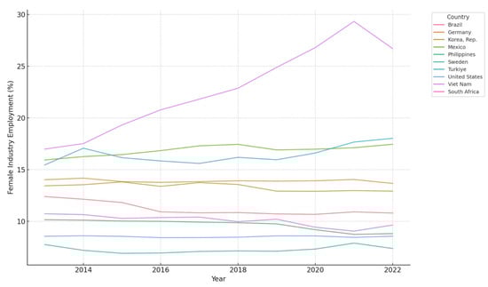In contrast, South Korea and the Philippines demonstrate declining trends, which may stem from automation, a transition toward service-based economies, or persistent structural barriers. These patterns are consistent with ILO (2021) findings, which emphasize that technological shifts and entrenched gender norms continue to limit women’s access to formal industrial employment in many settings. Collectively, the observed trajectories underscore the importance of national context and global industrial change in shaping gendered labor outcomes.