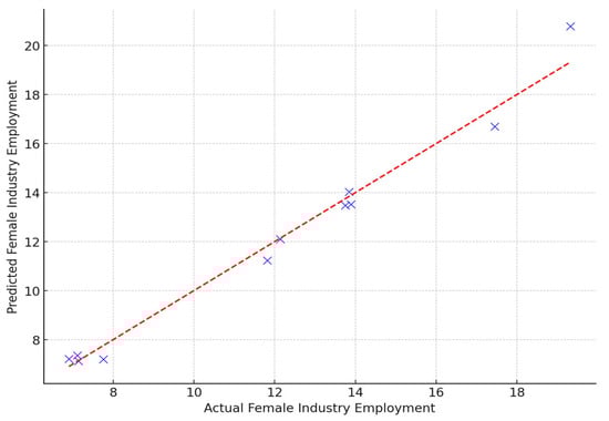 To better understand the factors shaping women’s participation in industrial employment, we conducted further analysis using the ETR model. The results reveal that indicators related to general female labor market engagement, such as FemaleLFParticipation15to64, FemaleLaborForceTotal, and FemaleEmploymentTotal, play the most significant role in predicting manufacturing employment (see Figure 3). This suggests that expanding women’s access to employment opportunities overall can directly enhance their presence in the industrial workforce. In contrast, education-related and broader demographic indicators were found to be less influential in the model. Their effects may be more indirect or vary depending on national context. The predicted-versus-actual plot also supports these findings. As seen in Figure 4, most data points are closely aligned with the diagonal line, indicating that the model performs well in estimating real-world outcomes.