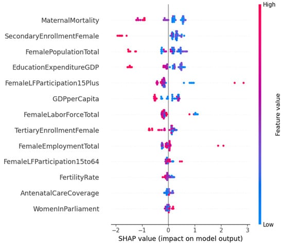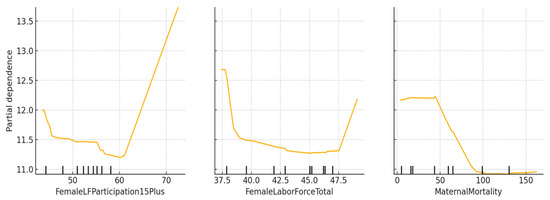 In addition to the PDP results, SHAP analysis was conducted to better understand how each feature contributes to the model’s predictions. As shown in Figure 6, general labor force indicators such as FemaleLaborForceTotal, FemaleEmploymentTotal, and FemaleLFParticipation15to64 have the most consistent positive impact on predicted female employment in manufacturing. Higher values of these variables are associated with stronger participation, highlighting their importance across different national contexts. On the other hand, variables like MaternalMortality and FertilityRate tend to lower the predicted values when they are high. This suggests that barriers related to health and caregiving continue to limit women’s access to industrial employment. Education-related variables, including TertiaryEnrollmentFemale and EducationExpenditureGDP, show more variable effects. This may reflect how the impact of education depends on other social or institutional factors. Overall, SHAP results support the idea that different structural indicators interact in complex ways to shape gendered labor outcomes.