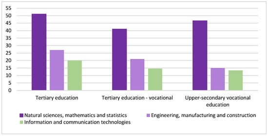 It is important to clarify that the acronym STEM includes sciences, technologies, engineering, and mathematics, but is an umbrella term used to group together disciplines that can be very different, even when we look for gender gaps in these educational and professional realms. For instance, there is a globally bigger representation of women in sciences and mathematics than in engineering and technology. Alice Eagly (2021) proposes the concept of “inconsistent gender gap” to express this differentiation. In fact, according to Eurostat data (Figure 1), while women represented around 51% of students in natural sciences, mathematics, and statistics; only 27% of students in engineering, manufacturing, and construction, and around 20% of students in ICT were female. Romania and Sweden were the countries doing better in ICT, with around 32% of female entrants, while some other countries did much worse, showing figures under 15% (Belgium, Lithuania, Spain, Slovakia, Netherlands).
