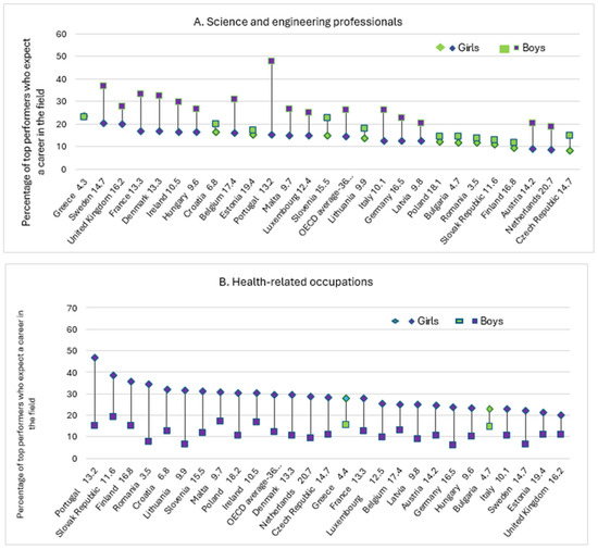 This gender gap begins early, with fewer 15-year-old girls reporting that they want to pursue a STEM career compared to boys (OECD 2019). Among the top ten occupations girls reported to expect for themselves, seven were in the healthcare sector and three related to teaching, law professions, and policy and planning management. Instead, boys reported a wider range of occupations, such as athletes, engineering professionals, motor-vehicle mechanics, and police officers. These results also apply to top-performing students in mathematics and/or science, which are critical disciplines for successful STEM paths (Figure 2a,b). According to the data in Figure 2, Portugal exhibits the largest gender gap in career expectations, while Romania shows the smallest.