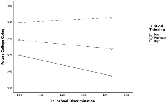 To further examine the significant interaction between in-school racial discrimination and critical thinking, post hoc simple slopes analyses were conducted using the PROCESS macro in SPSS (Model 1; Hayes 2013). The associations between in-school racial discrimination and future college-going beliefs were estimated at one standard deviation below the mean (low), at the mean (moderate), and one standard deviation above the mean (high) levels of critical thinking.
