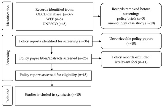 The screening process of policy documents was supplemented by a thematic analysis of documents. It was conducted according to the following six-stage process suggested by Braun and Clarke (2006): (1) familiarizing with data, (2) generating codes, (3) generating themes, (4) reviewing themes, (5) defining and naming themes, and (6) summarizing data. We collected data for the two selected themes according to the research questions of the scoping review. Firstly, we analyzed the concept of “skills policy” focusing on future skills policy and how it helps to bridge the skills gaps. Secondly, we identified the global trends driving changes in education.