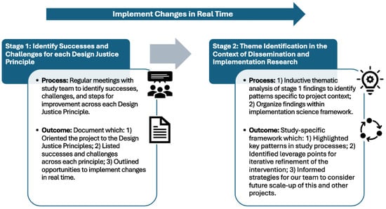 Our process occurred between January 2023 and June 2025 and included two stages in which our team: (1) identified successes and challenges across each of the ten Design Justice principles, and (2) synthesized cross-cutting themes and organized them to align with the five key dimensions of D&I methods (Figure 1). These stages and brief descriptions of their application and outcomes are outlined in further detail below. Information generated through this analysis was used to identify targeted, actionable steps to adapt study processes and procedures to more effectively center YA-CSI.