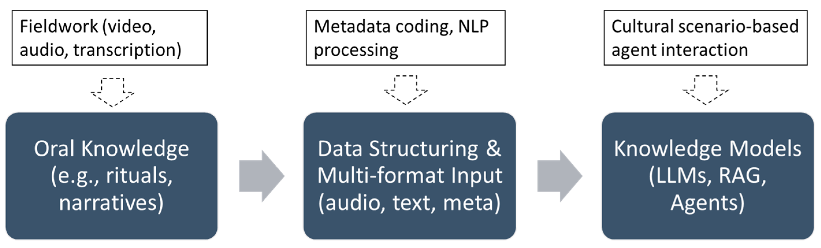 The research adopts a longitudinal, participatory, and technology-integrated methodology to facilitate the transformation of orally transmitted Indigenous TEK into digitally operable and culturally respectful knowledge systems. Bridging ethnographic inquiry with computational design, we adopt a co-constructive research paradigm that underpins community participation, iterative knowledge modeling, and the responsible deployment of agentic artificial intelligence. Our methodology is shaped by two interdependent trajectories: the cultural logic and embodied practices of TEK observed through long-term fieldwork, and the affordances of semantic data processing and adaptive AI systems capable of dialogical, permission-aware interaction. By integrating these dimensions, we seek to construct a system in which Indigenous knowledge is not merely digitized, but meaningfully structured, contextualized, and sustained through culturally congruent interaction models. The section presents the stepwise transition from ethnographic engagement to technical implementation, including the modeling of knowledge layers, agent design strategies, and the ethical protocols that govern system development and use.