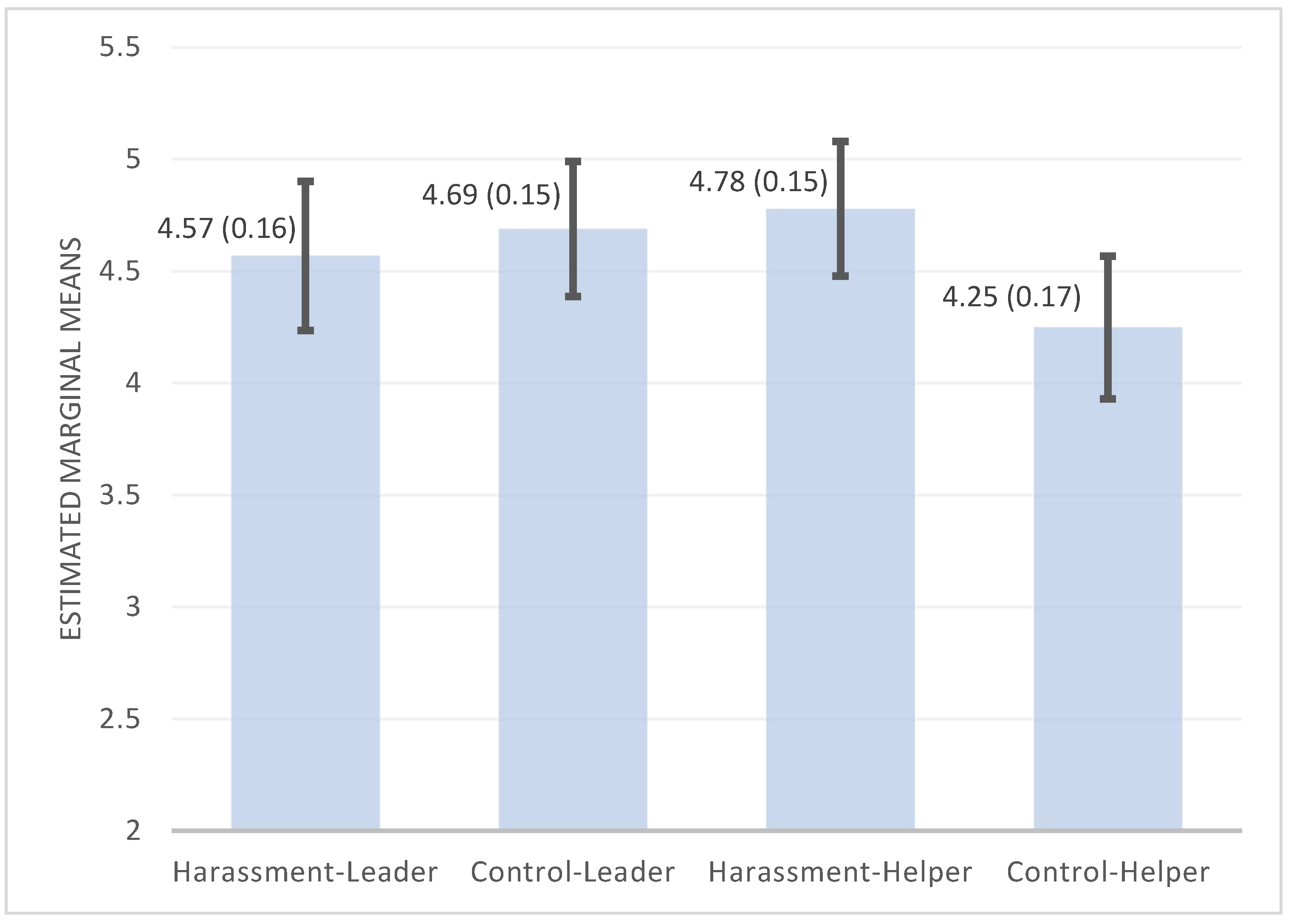Figure 1 reports the estimated marginal means and standard errors, with 95% confidence intervals, across conditions. Positive numbers indicate favorable attitudes about working with the male partner. As seen in