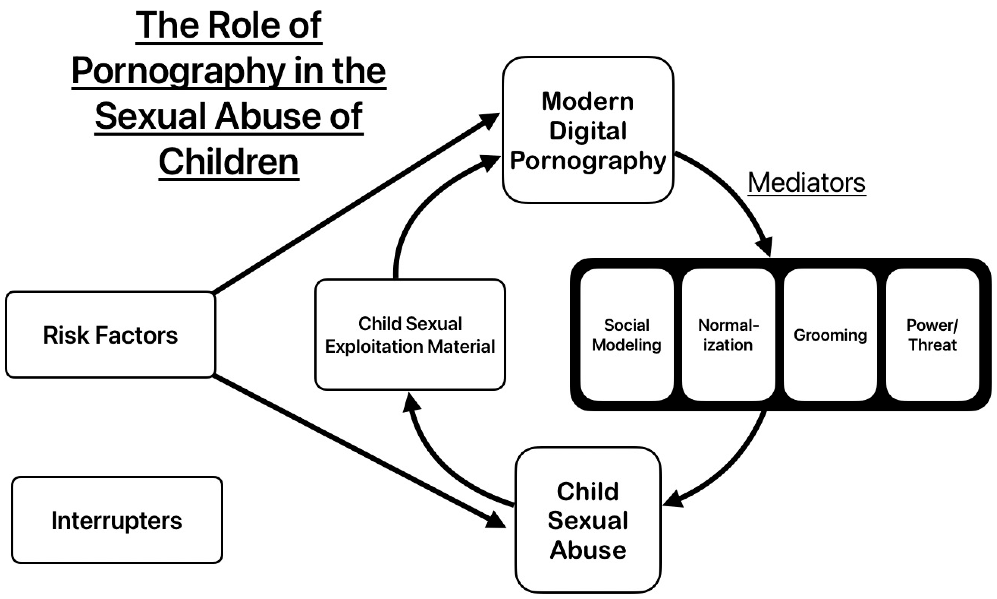 Figure 1). The model depicts cyclical and overlapping relationships between risk factors, pornography, potential “interrupters,” and CSA.