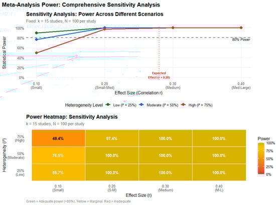 For the minimum threshold scenario of k = 15 studies with N = 100 participants per study, the analysis indicated excellent statistical power, exceeding 99%, to detect the expected effect, as shown in Figure 1. Sensitivity analyses revealed that power remains adequate (above 80%) for medium effects (r ≥ 0.30) across all heterogeneity levels. However, power drops below this threshold for small effects (r < 0.20) when heterogeneity is high.