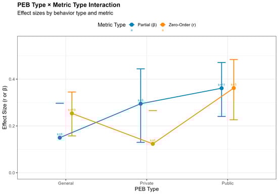 The plot illustrates the interaction between the type of pro-environmental behavior (General, Private, Public) and the effect size metric. Blue markers represent partial/adjusted coefficients (β), while orange markers represent zero-order correlations (r). Error bars indicate 95% confidence intervals. The number of effect sizes (k) is reported above each data point. Note the divergence in estimates for Private PEB, where partial coefficients significantly exceed zero-order correlations. Note. a: Zero-order (r) and Partial (β) correlations show unequivalent patterns across pro-environmental behavior types, where Public behaviors show stronger associations with eco-anxiety (r/β ≈ 0.36) than private behaviors (r/β ≈ 0.17–0.30), regardless of metric type.