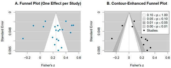 Funnel plots for publication bias assessment. Panel (A) displays the standard funnel plot, where each dot represents a study’s effect size (Fisher’s z) plotted against its standard error; the asymmetry suggests potential small-study effects. Panel (B) presents the contour-enhanced funnel plot, with shaded regions indicating levels of statistical significance: dark grey (p < 0.01), medium grey (p < 0.05), light grey (p < 0.10), and white (p > 0.10). The scarcity of studies in the white (non-significant) region supports the presence of publication bias.