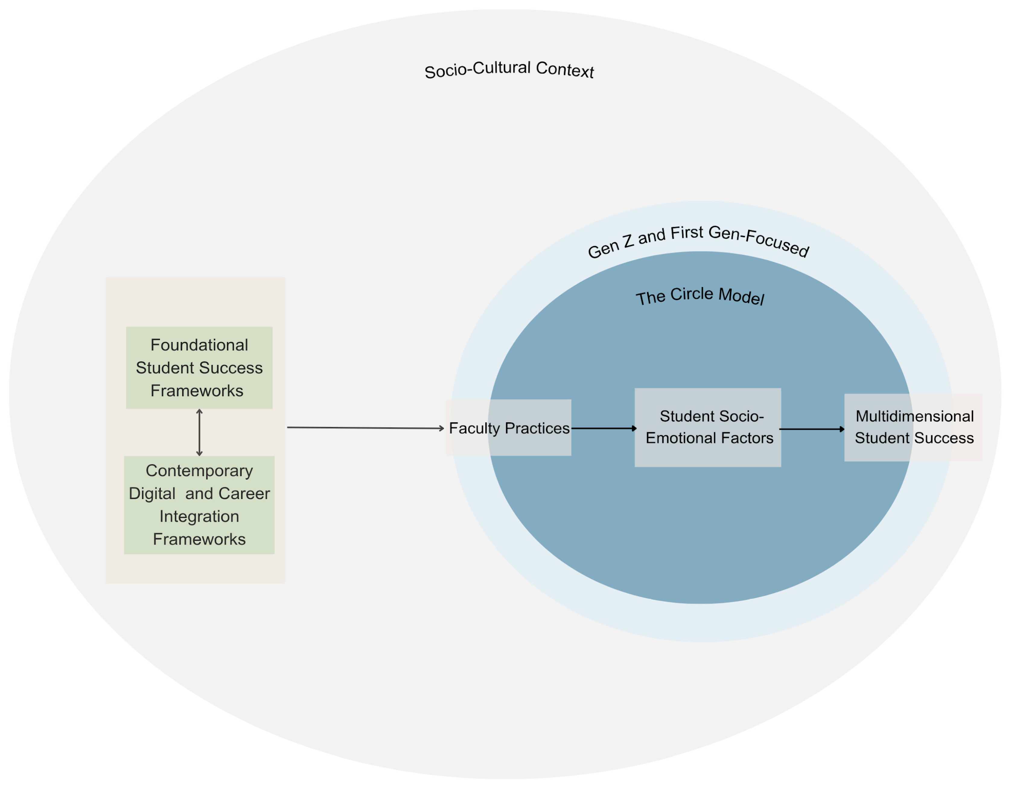 Tareke et al. 2025). Researchers are exploring ways to combine human and digital assets to foster student success. The current paper fully embraces this movement by synthesizing student-centered and digital integration theories while connecting evidence-based practices with clear faculty-facing practices. The Circle model draws on the literature on effective practices and socio-emotional mediators. Through the lens of the current socio-cultural context, the model outlines a holistic, direct approach for faculty to make the greatest impact on student learning and success outcomes. A visual overview of the integration of existing frameworks within the current socio-historical context is shown in