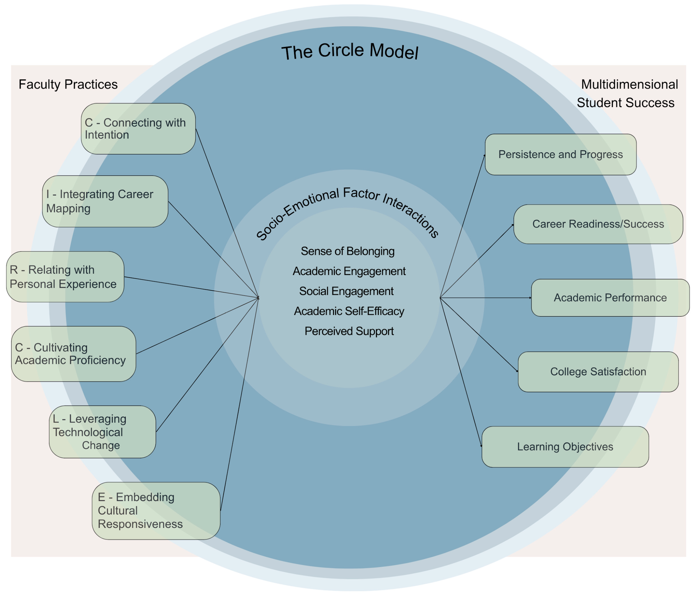 The Circle model integrates and expands upon the discussed frameworks by applying their core concepts to explain why faculty behaviors predict socio-emotional factors and multidimensional student success outcomes. The concepts from traditional student success models are highly applicable and require only review in light of new societal developments. This would be the post-COVID-19, technologically savvy education system in the US. These student-centered frameworks are especially informative in understanding the human experiences of pursuing a college degree. The Circle model includes a few core concepts from the traditional student-centered frameworks. These include the ideas that (1) student success is a function of the student and environment interaction, including faculty behaviors; (2) student perceptions and experiences predict student success; and (3) student success is multidimensional and a result of multiple psychological and environmental factors. Further details on existing frameworks that inform the conceptual model are provided in