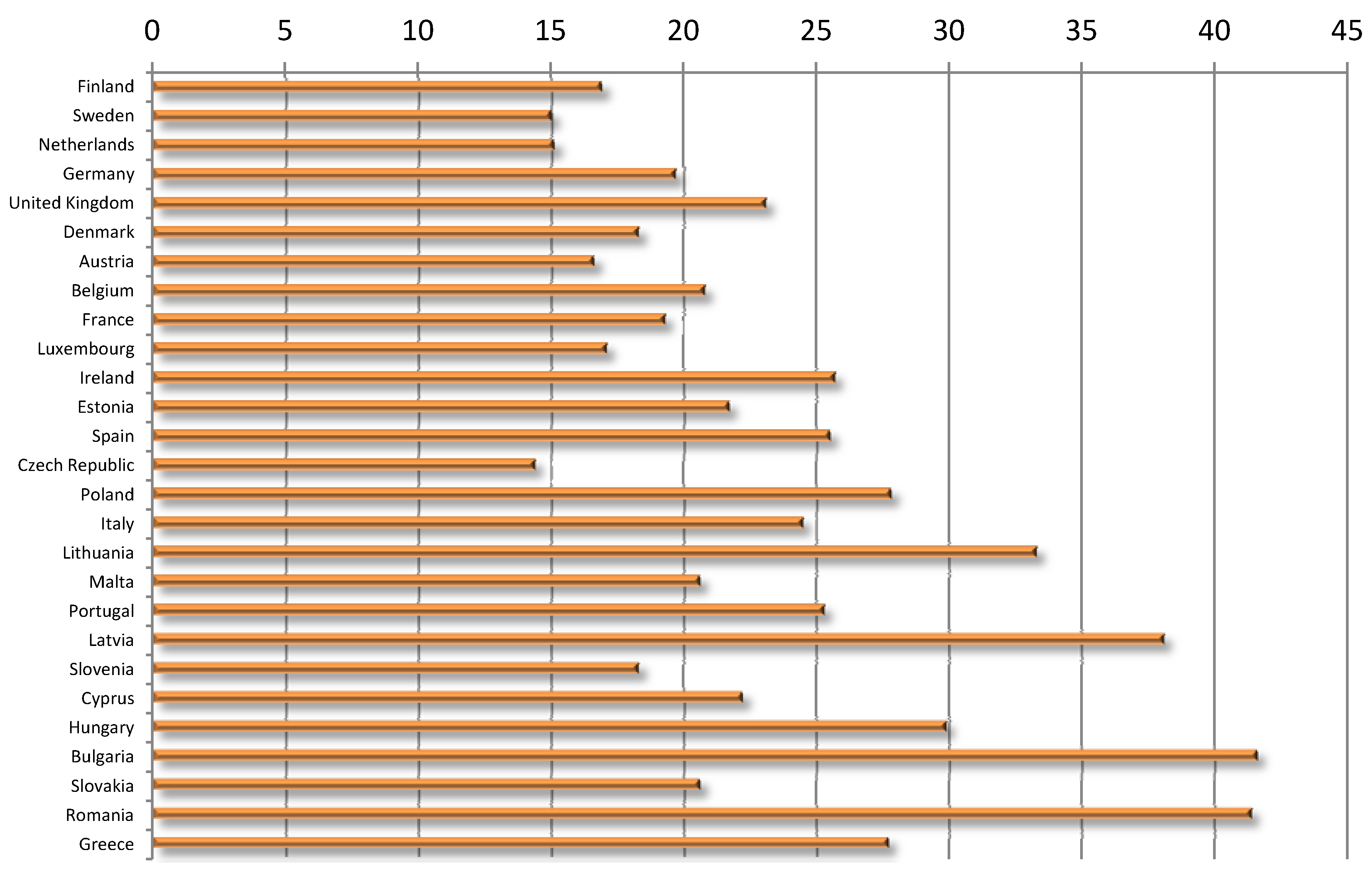 Not surprisingly, in the periphery of the EU, the percentage of people belonging to the socially threatened groups greatly exceeds the respected ratio in the core territories: according to the 2012 Eurostat data (for year 2010), 23.4% of the EU’s population is living in or at risk of poverty and social exclusion [29]. The EU average is well preceded by Bulgaria (41.6%), Romania (41.4%), Latvia (38.1%), Lithuania (33.4%), and Hungary (29.9%). At the other end of the scale, we find the Czech Republic (14.4%), the Netherlands (15.1%), Sweden (15%), Austria (16.6%), Finland (16.9%) and Luxembourg (17.1%). That is, differences are huge (Figure 4).2