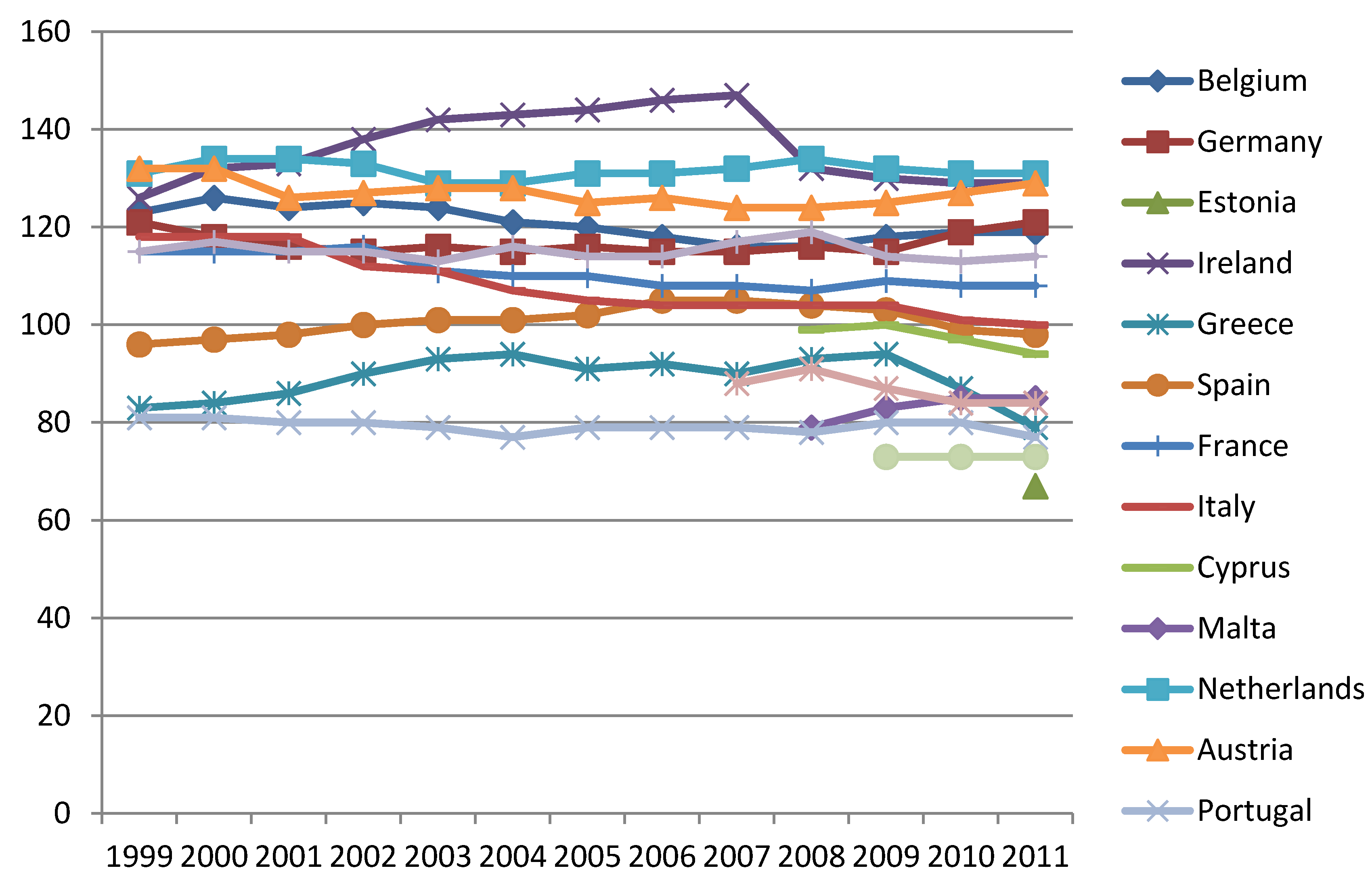 | Ireland | 126 | 132 | 133 | 138 | 142 | 143 | 144 | 146 | 147 | 132 | 130 | 129 | 129 |