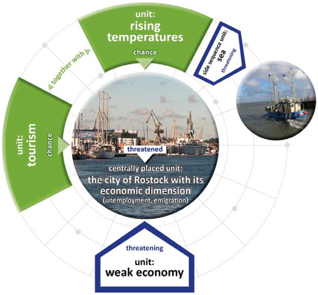 When taking the heuristic dimensions of the extended vulnerability and resilience approach into account (see Figure 4), it is conspicuous that in comparison to Lübeck, quite apart from climate change issues, the centrally placed entity is not a physical-material part of the city but the economic dimension of the whole city. Additionally, with regard to climate change, also the coastal area, mainly the sea—or to be more concrete, the marine biology—is constructed as being vulnerable because various fish stocks will probably disappear. This unit, however—which is a material factor—has only the character of a side scene in the arrangement. Other units of the relational network are the structurally weak economy, rising temperatures as well as an (anticipated) growth in the tourism sector. The interdependences in the relational web can be described as follows: The structurally weak economy is seen as threatening and the whole city as being threatened (unemployment, emigration). Besides that, the marine biology is viewed as being endangered; here, rising temperatures are considered a factor of endangerment.
