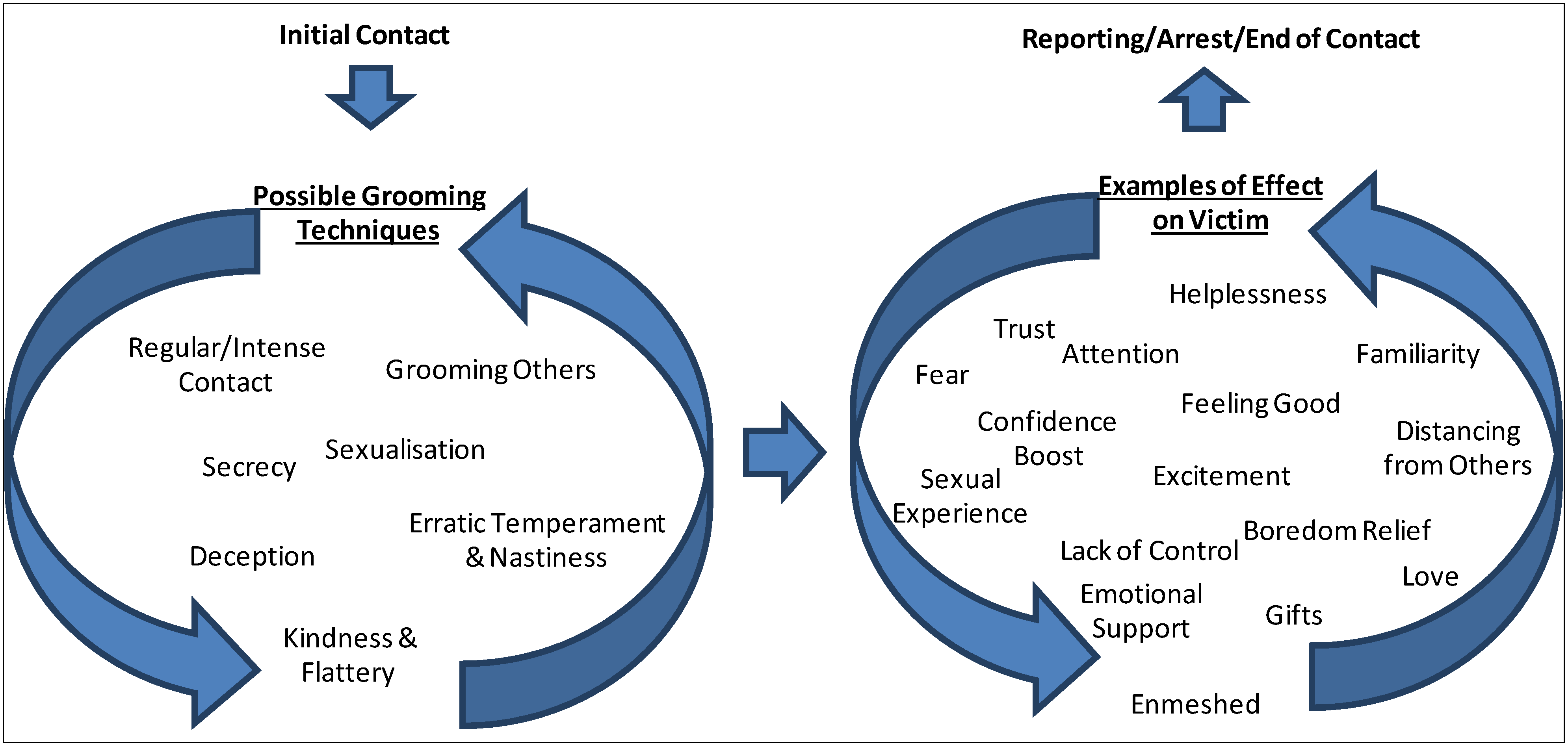 | Kindness and Flattery (Including generosity, good listener, genuine, fun, helping with homework, supportive, traditional and sexual compliments, promises about the future, personality and physical compliments) | Feeling good, builds trust and basis for a relationship, confiding in abuser, wanting to talk more, receiving gifts, love, feeling special, feeling beautiful, confidence boost, hopeful about future, enmeshed in relationship. |
