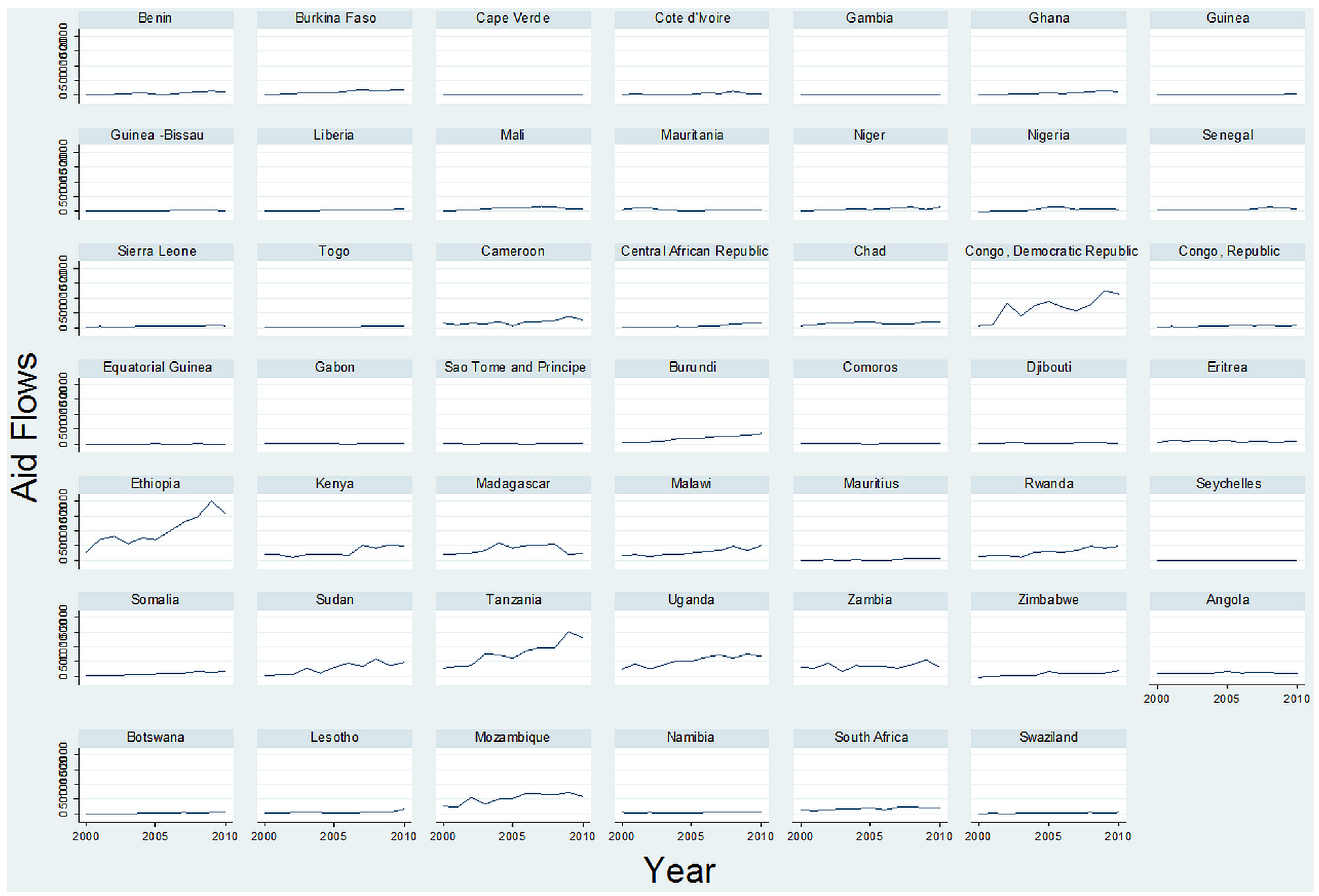 We computed means and standard deviations (SD) for all variables (Appendix B). Figure 2 and Figure 3 depict trends in the volume of aid from the EU commission towards Sub-Saharan African recipient states and changes in good governance. In regard to the 2005 commitments of the EU for increasing development aid, we observe that upward aid flow trends from 2000 to 2010 are infinitesimal and remain steady in all regions of Sub-Saharan Africa, except for the Democratic Republic of Congo, and several East African states, where aid flows accelerate considerably after 2005, especially in Ethiopia, DR Congo and Tanzania. The dataset comprises aid flows to all 48 Sub-Saharan African countries for a period of 10 years; therefore, a small fraction of the sample could account for potential skewness. However, as depicted in the graphs, this does not necessarily affect the overall descriptive results, as the results are consistent throughout the vast majority of the sample. At first glance, it seems sensible that these countries attract so much foreign aid for being some of the poorest countries in the world having severe deficiencies in basic public and social structures. However, except for Tanzania and Rwanda, which have attained relative political stability and have good potentials at reaching several Millennium Development Goals, the rest are classified as fragile states. Sudan had been involved in a devastating civil war for the past two decades, and its current engagement in the Darfur region causes severe internal instability. Ethiopia ranks very low on the Human Development index, and its geopolitical position in the Horn of Africa is considered highly strategic. Additionally, Congo still struggles in the aftermath of conflict and lacks basic infrastructure.