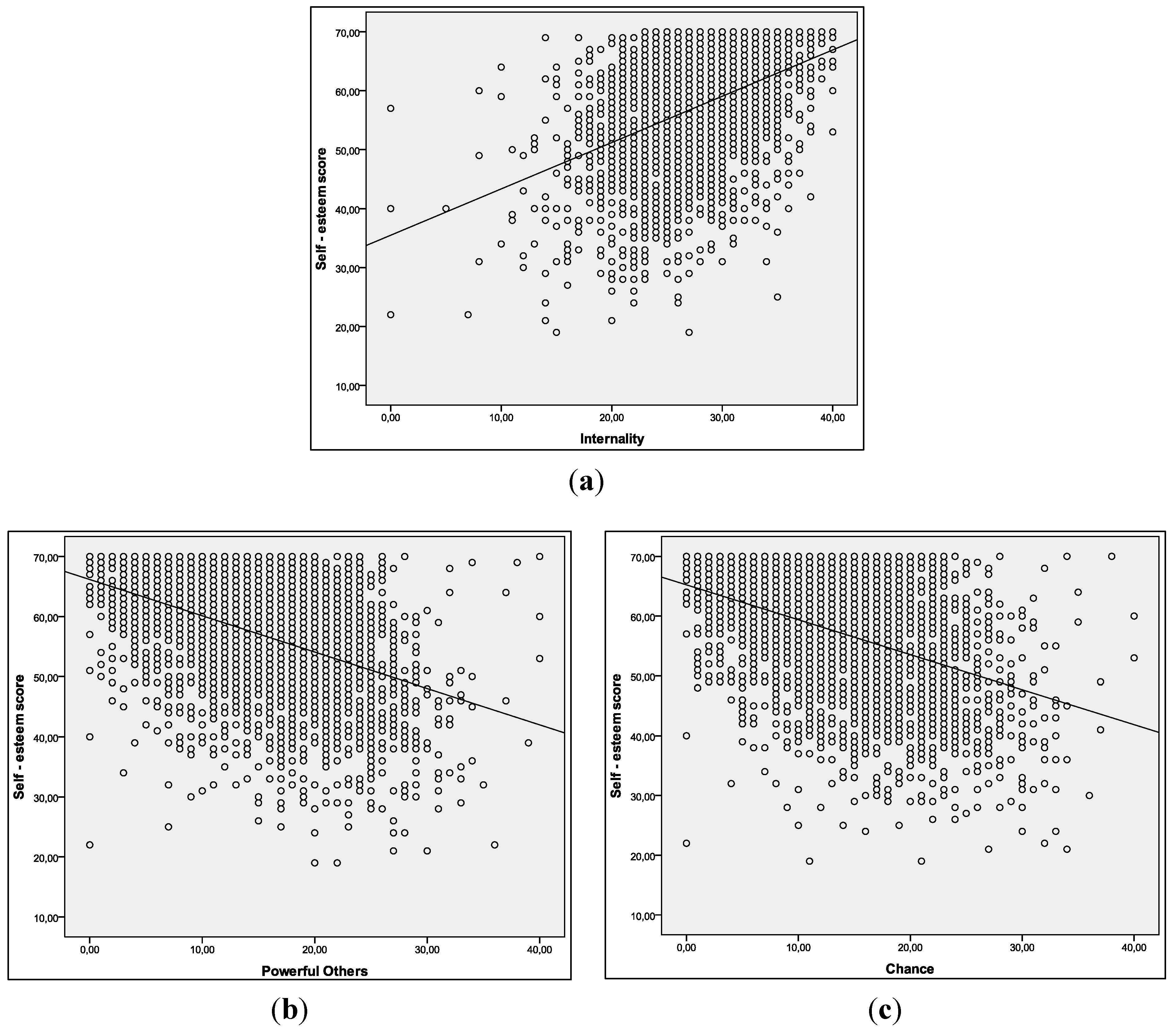 (a) Correlation between self-esteem and Internality; (b) Correlation between self-esteem and Powerful Others; (c) Correlation between self-esteem and Chance.