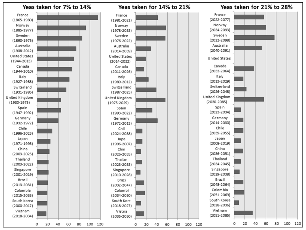 Number of years taken or predicted to take for three aging transitions in selected countries. Note: Created from the Organisation for Economic Co-Operation and Development (OECD) and UN demographic database. Years in parentheses are the periods during which each aging transition occurred or is predicted to occur.