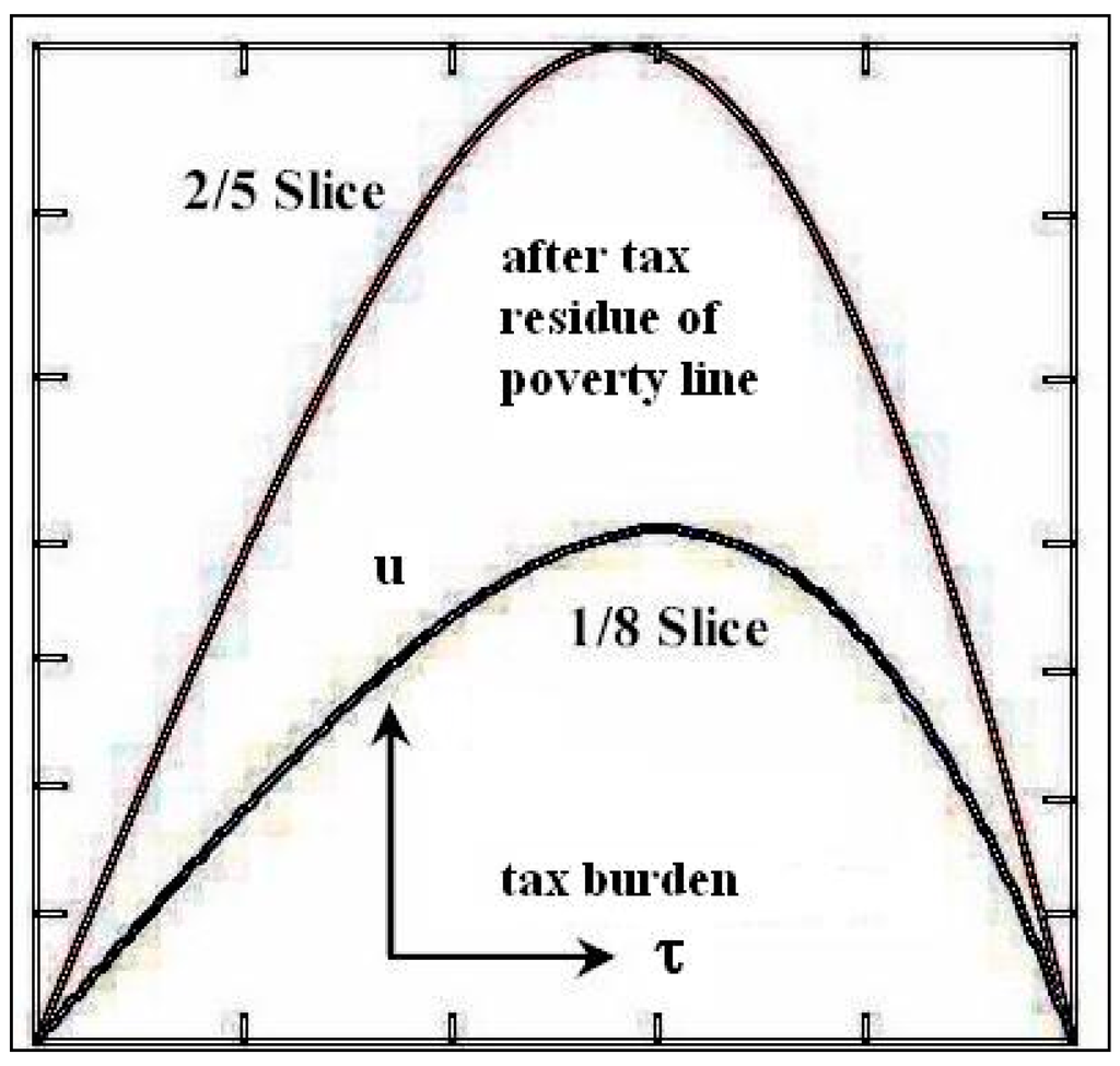 | Budget constraint imposed on the relief payments finance in accordance with the share x of the wealth-pie—the tax-revenue. | |