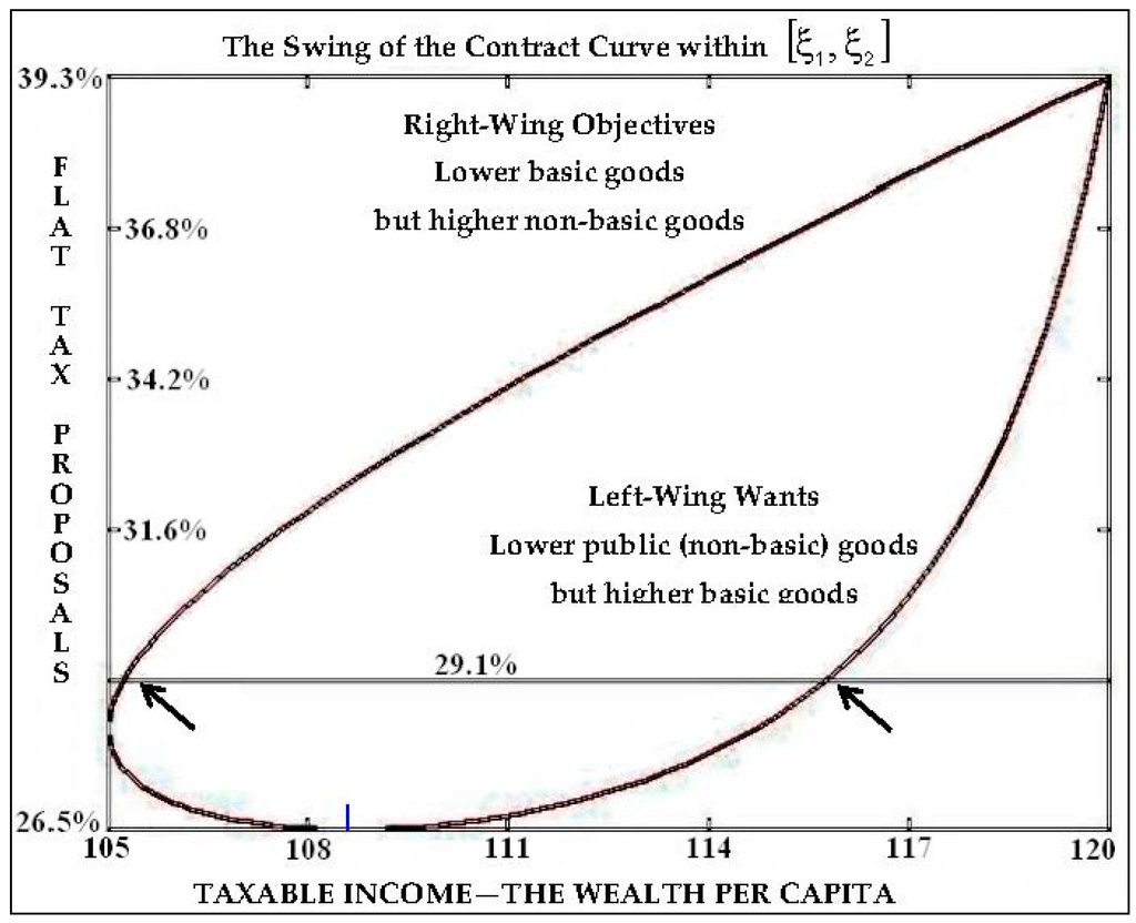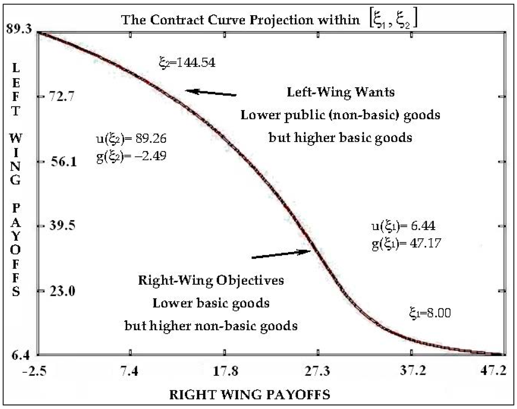 In what follows, we investigate the payoffs of the left- and right-wing politicians. The consensus occurs at outcomes under the constraint that the variation in policy does not improve the position of the left-wing politicians; rather, the policy emerges as the point on the contract curve as a fiscally idempotent outcome.